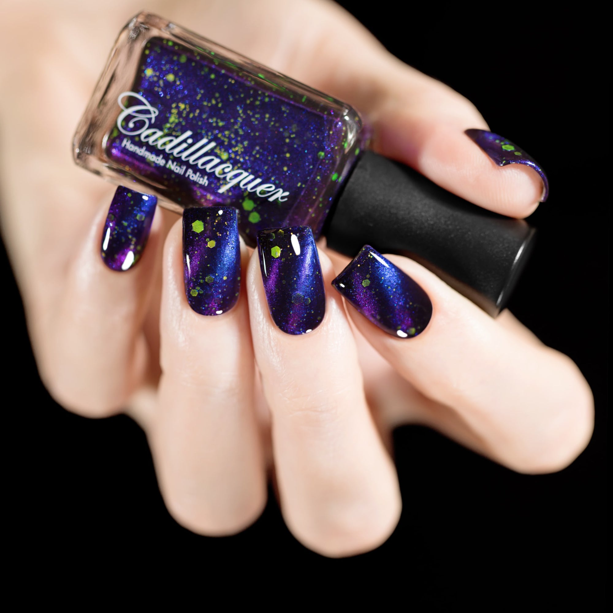 A blue to purple magnetic in a black base, with matte neon green glitter.