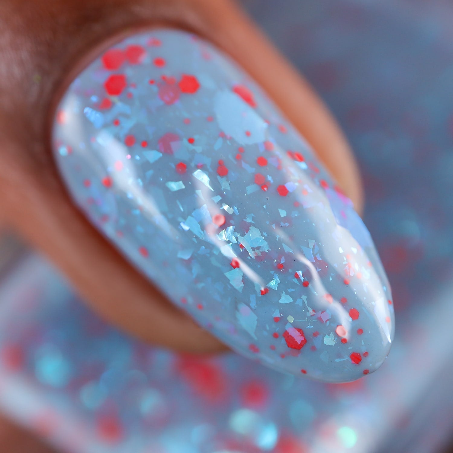 A light blueish grey crelly, with matte red glitter and light blue iridescent flakes