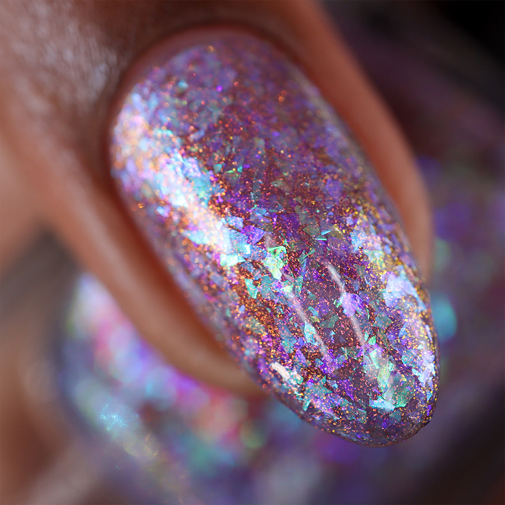 A dusty purple nail polish with a copper / gold / green shifting aurora shimmer and iridescent flakes in green and purple.