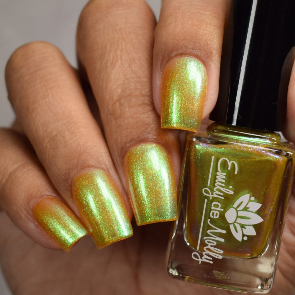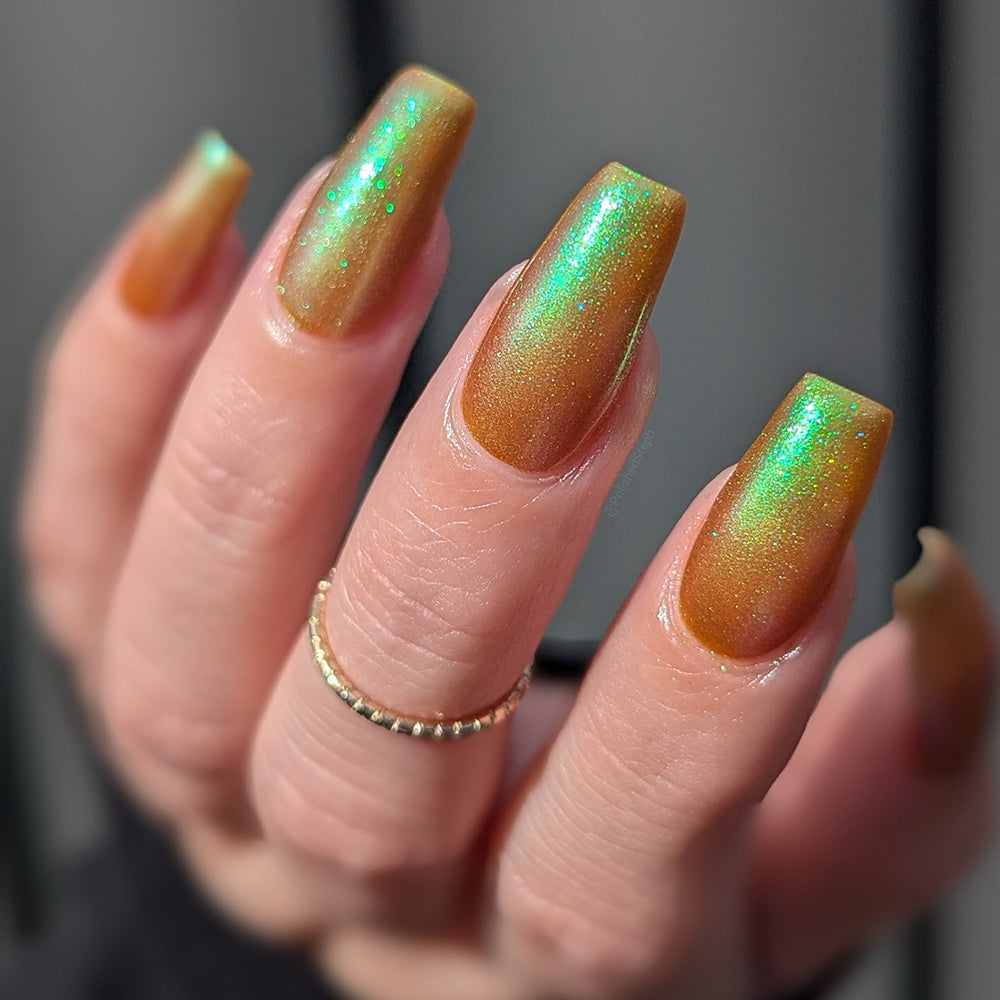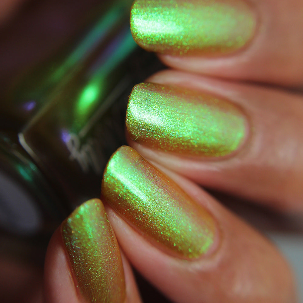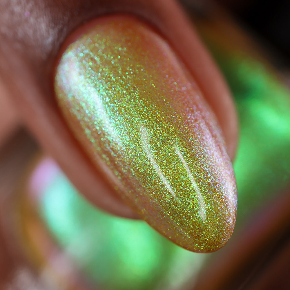 A grungy yellow nail polish with a strong green / purple shifting shimmer.
