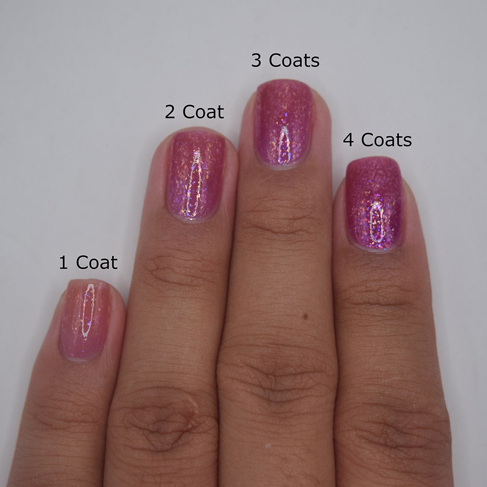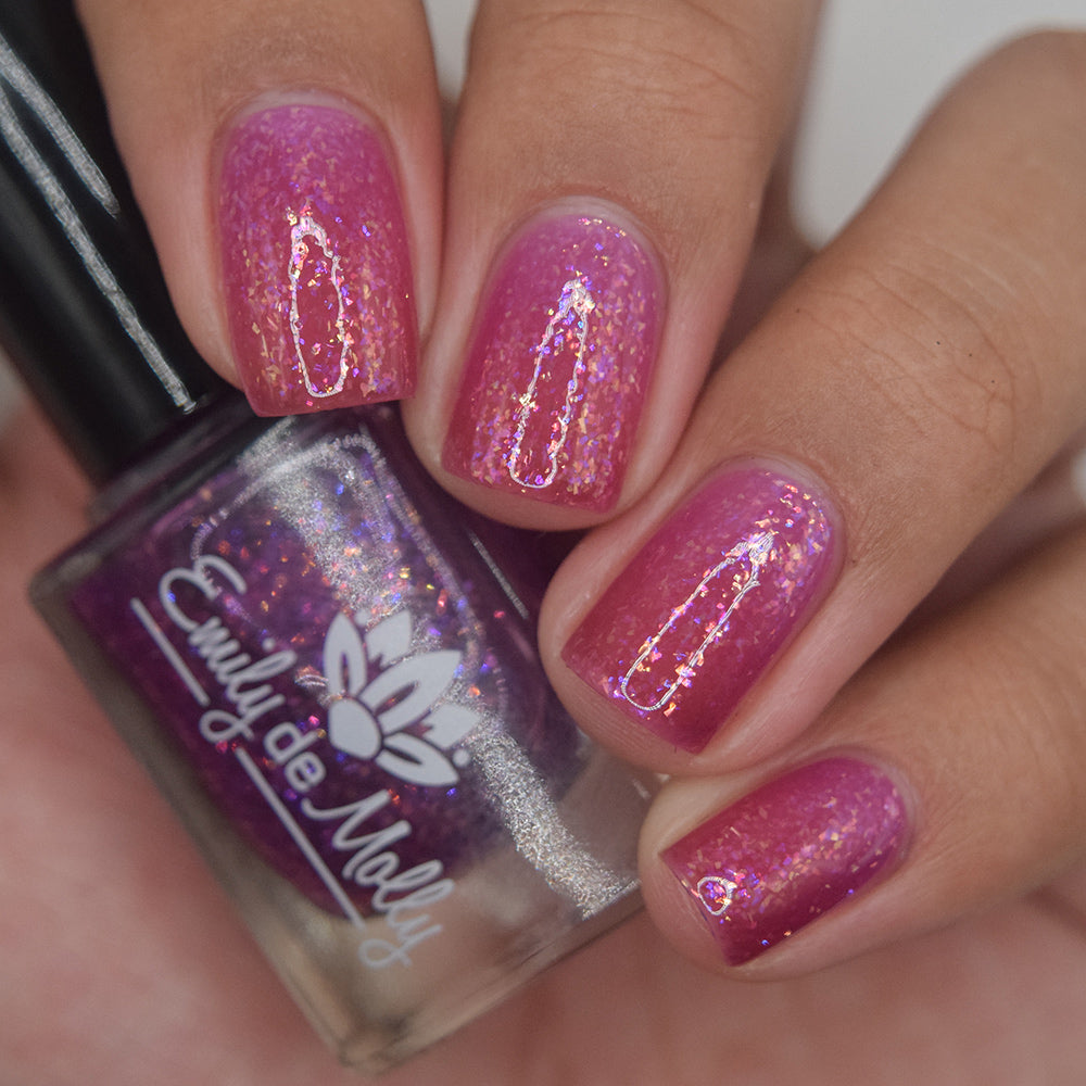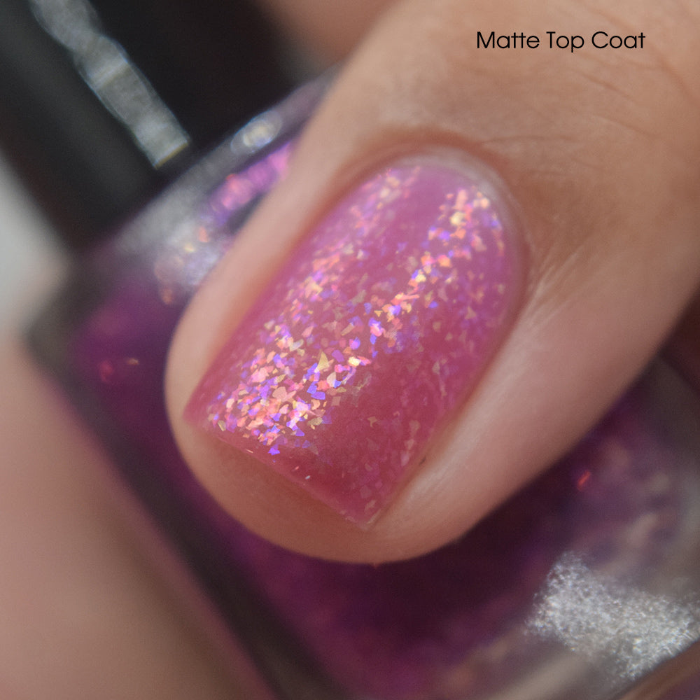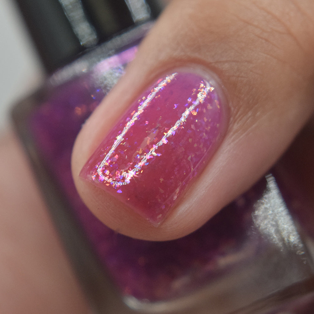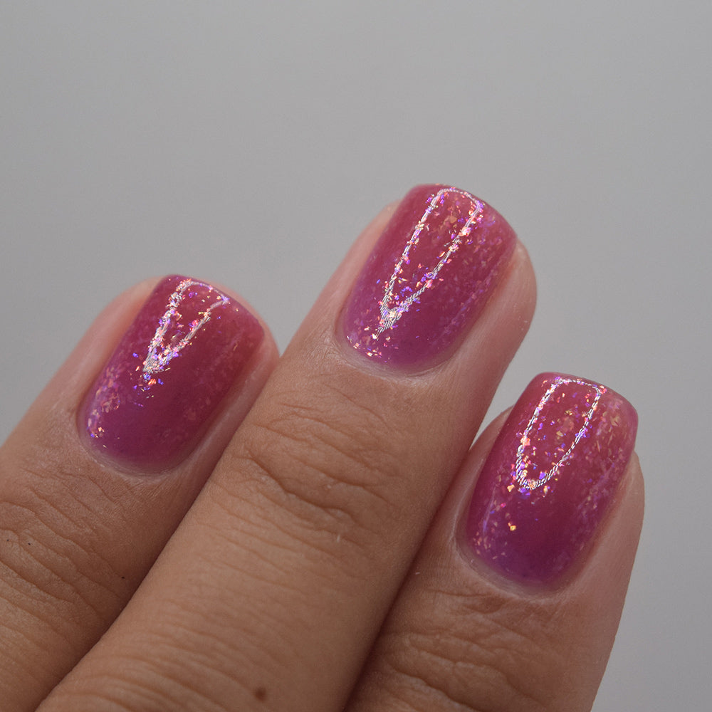 A sheer purple / pink jelly nail polish with assorted iridescent flakes.