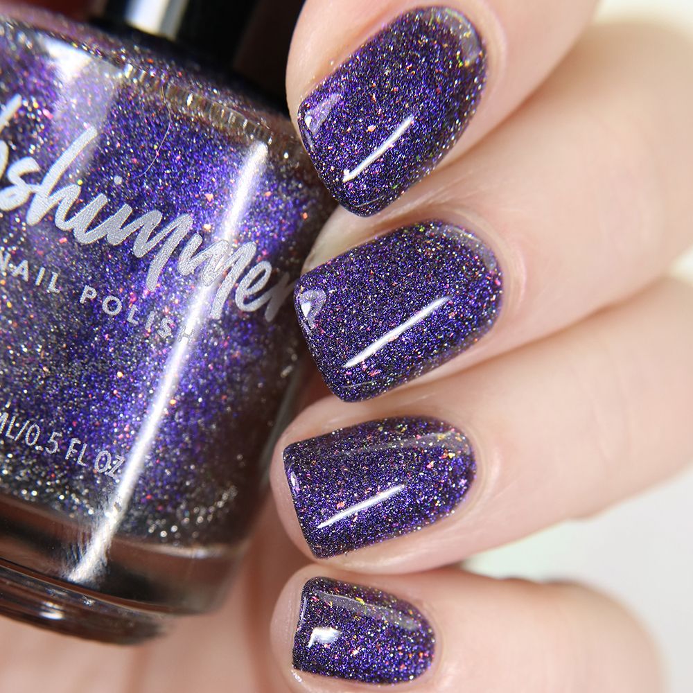 I’ll Bewitch You Shortly is an enchanting reflective, shifty nail polish made to twinkle and shine with magnetic properties. When worn without a magnet, an indigo-to-blue-to-midnight shift sets off magical pink sparks that shift into orange and gold. In brighter light or under flash, silver reflective glitter comes out to play, amping up the blue shade. When used with a magnet, the black background sets off the sparks and the purple-to-blue shift of the magnetic pigment. Wear without topcoat for a fun textured look (the maker’s favorite). This shade looks magical both with and without using a magnet, so try wearing it both ways!
