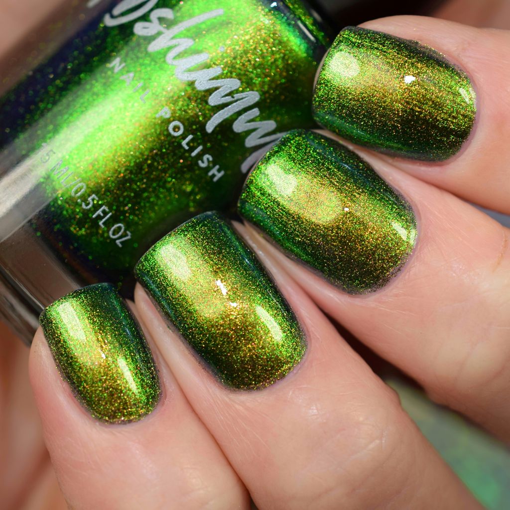 In A Pickle is a vibrant green, multifaceted chrome nail polish that easily catches the eye as it shifts between colors. This multichrome shade features a warm golden hue that accents the green, catching hints of orange, deep blue, and near-navy hues. Best in 2 coats.