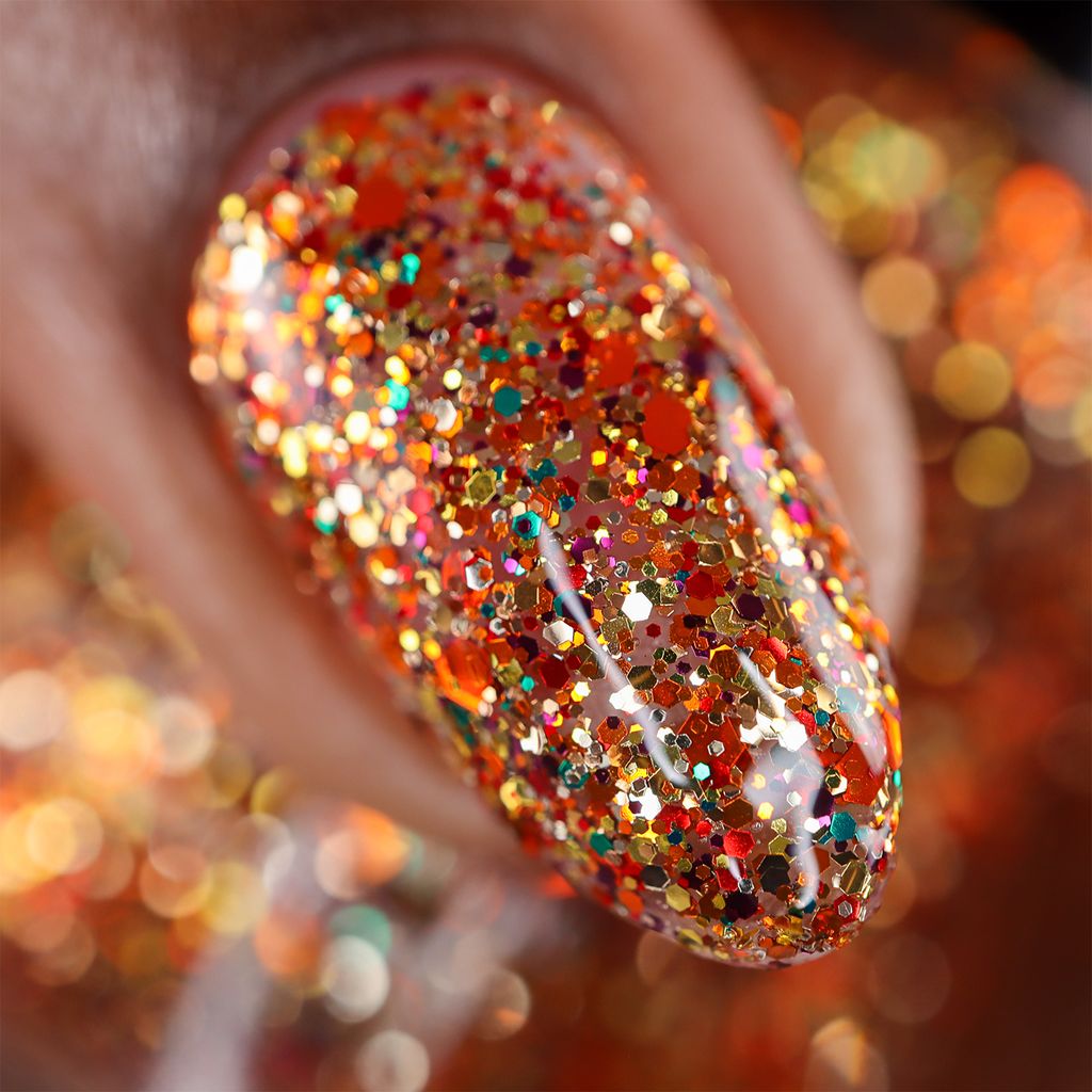 It’s Crunch Time is an autumn leaf–inspired mix of metallic hex glitters in a clear base. Worn in one layer over your favorite autumn crème, the mix of gold, copper, sand, red, burgundy, orange, and green echoes those piles of fallen leaves. Layer in two or three coats for a full-coverage manicure or accent nail perfect for autumn.