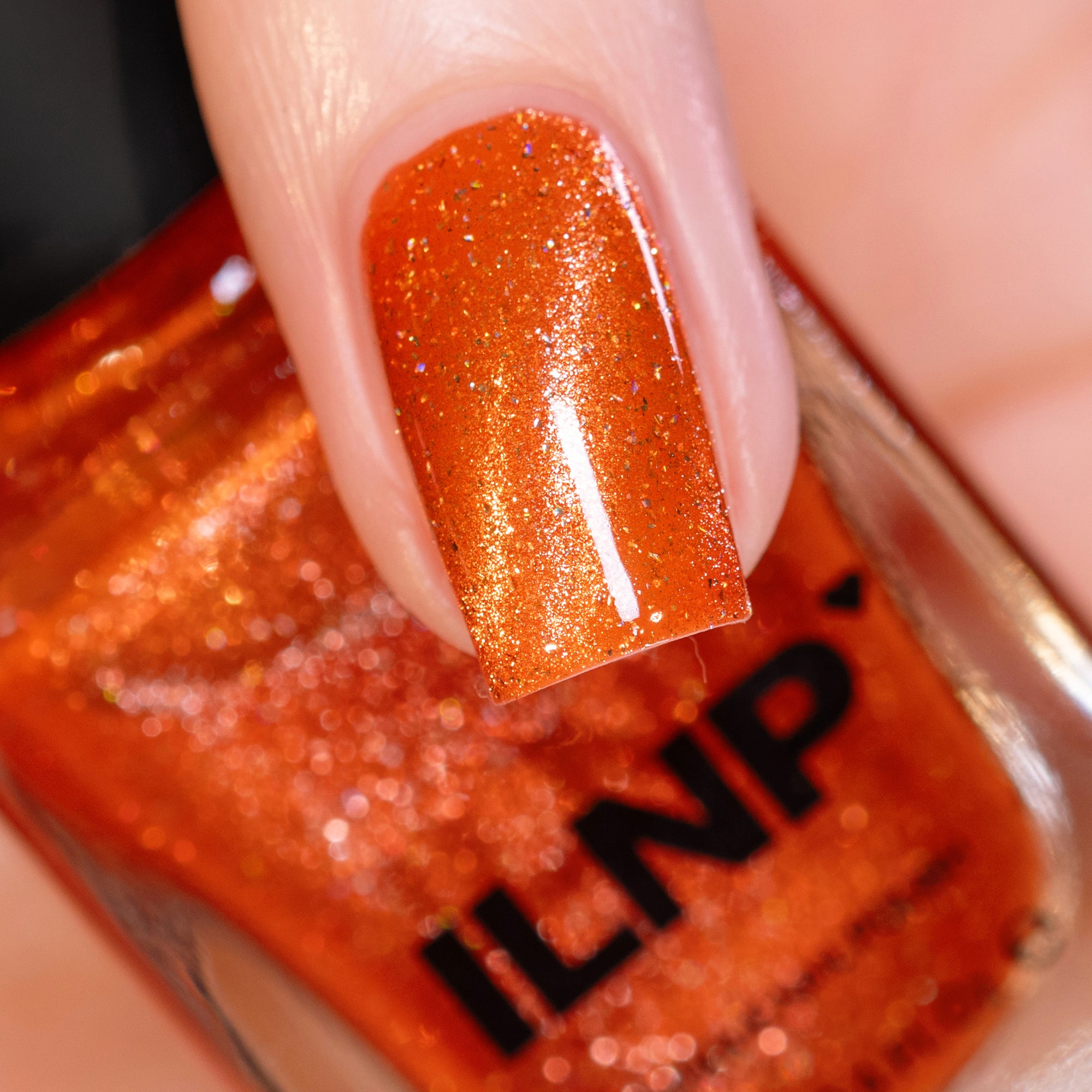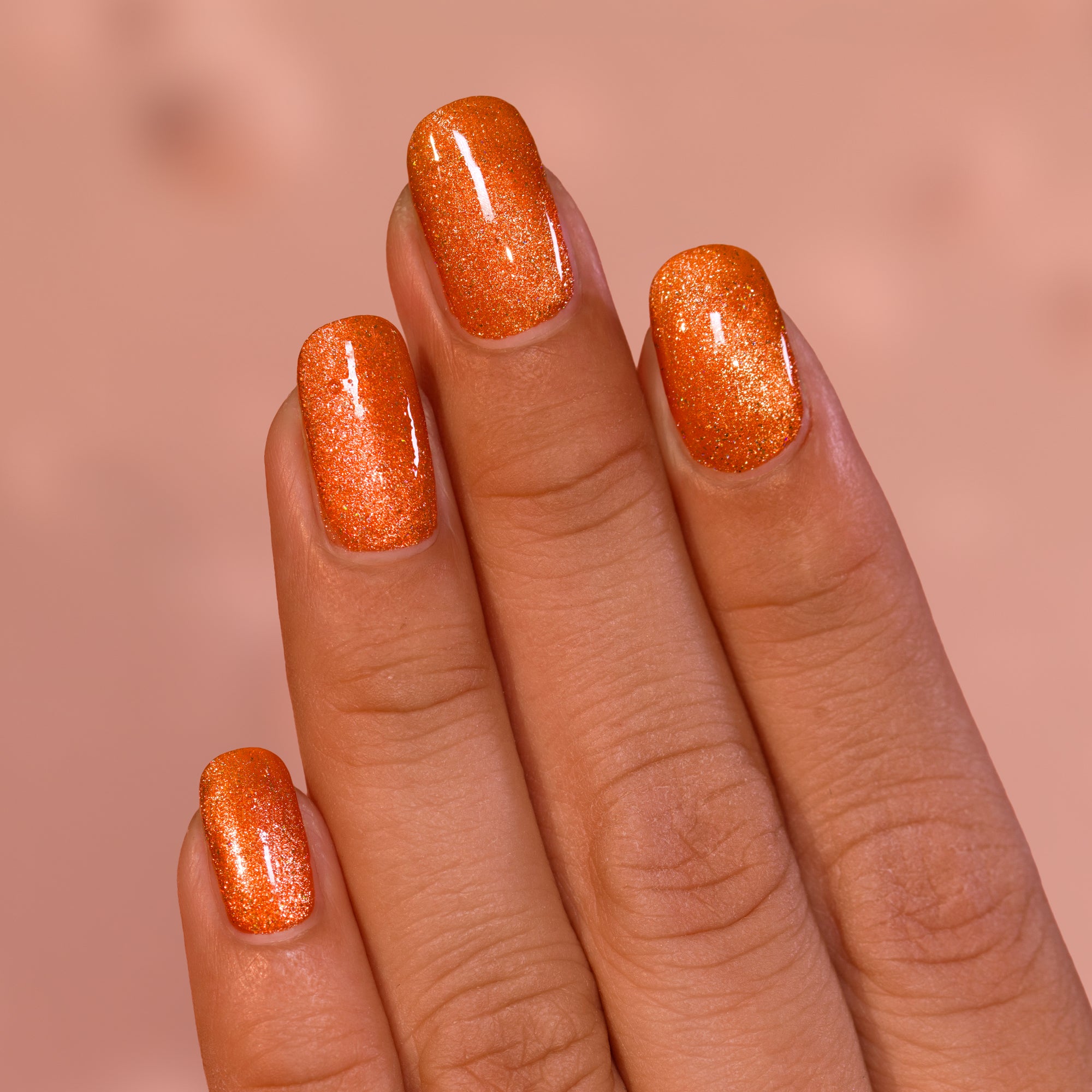 Juicy orange glows with warmth as holographic sparkle dances like sunlit bubbles, accented by a light scattering of reflective silver flakes. Magnetic shimmer threads through the base, lighting up bright citrus-orange tones that feel lighter and more radiant with every shift. Playful and radiant, Orange Pop delivers a citrusy burst of color that will keep you coming back for more.