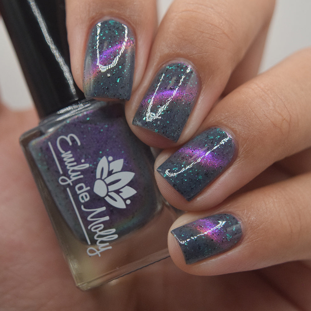 A medium grey nail polish with black and green chrome flakes and purple / pink / gold shifting magnetic effect.
