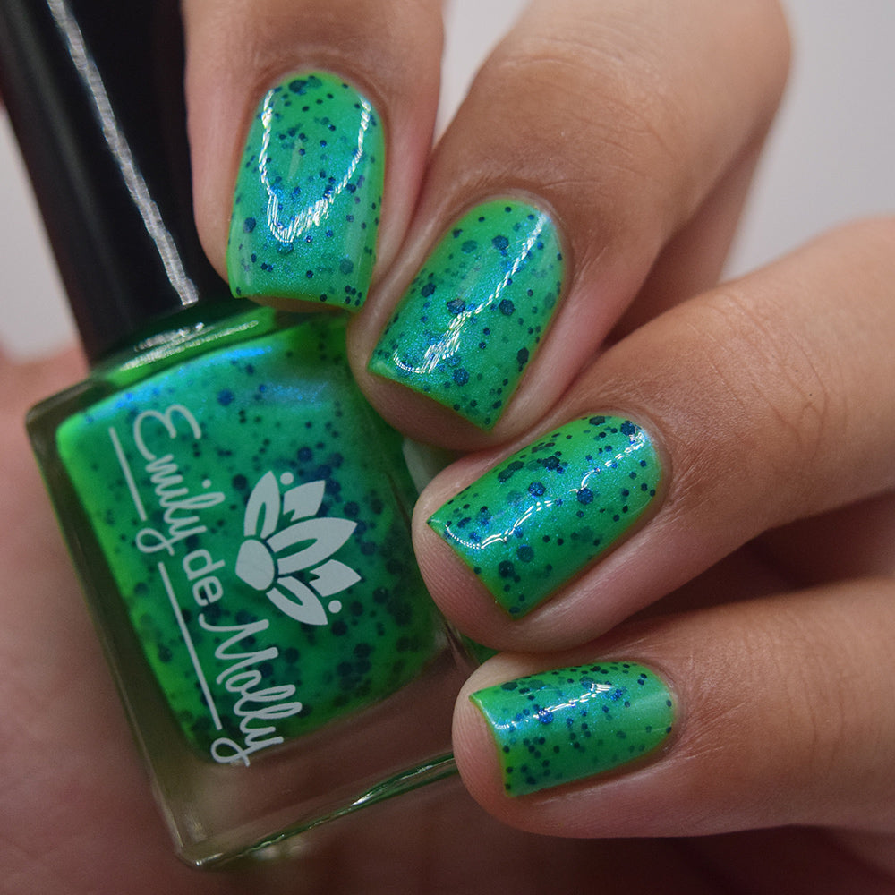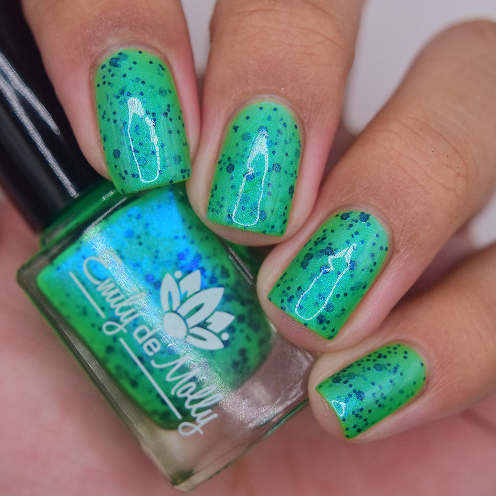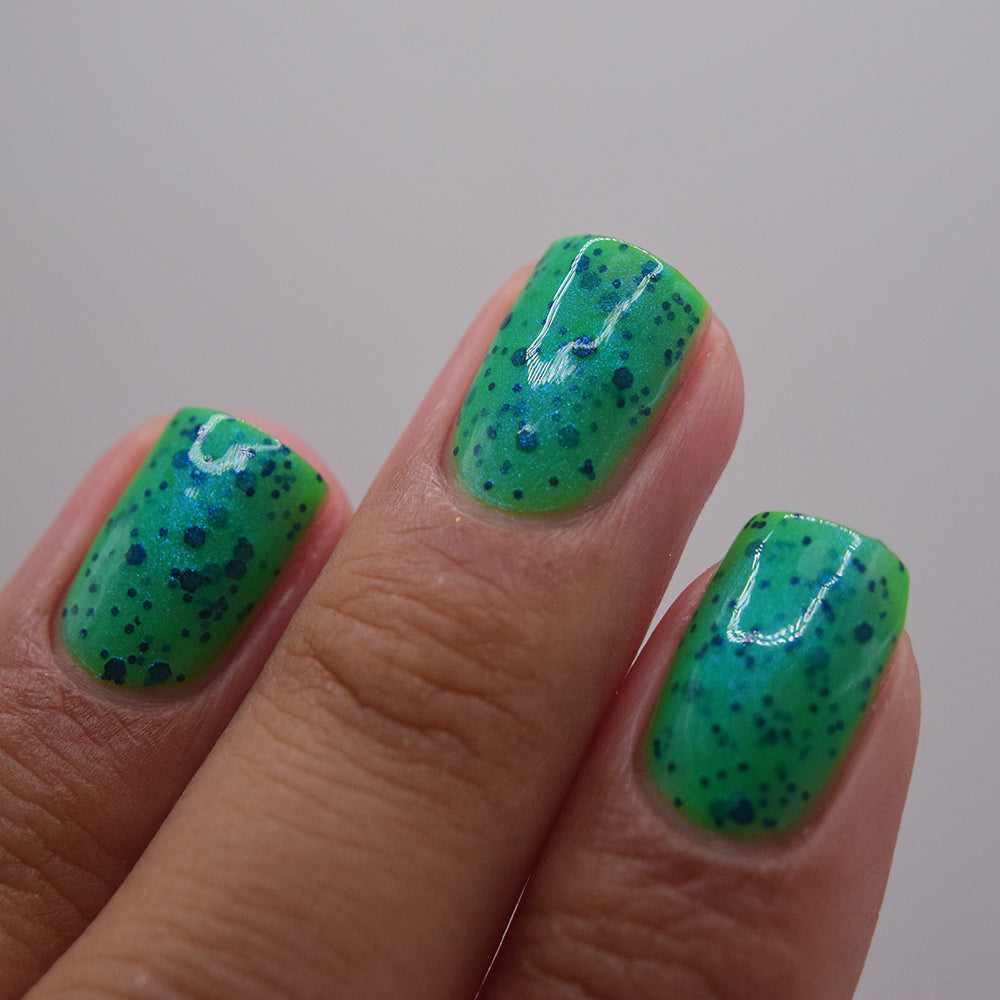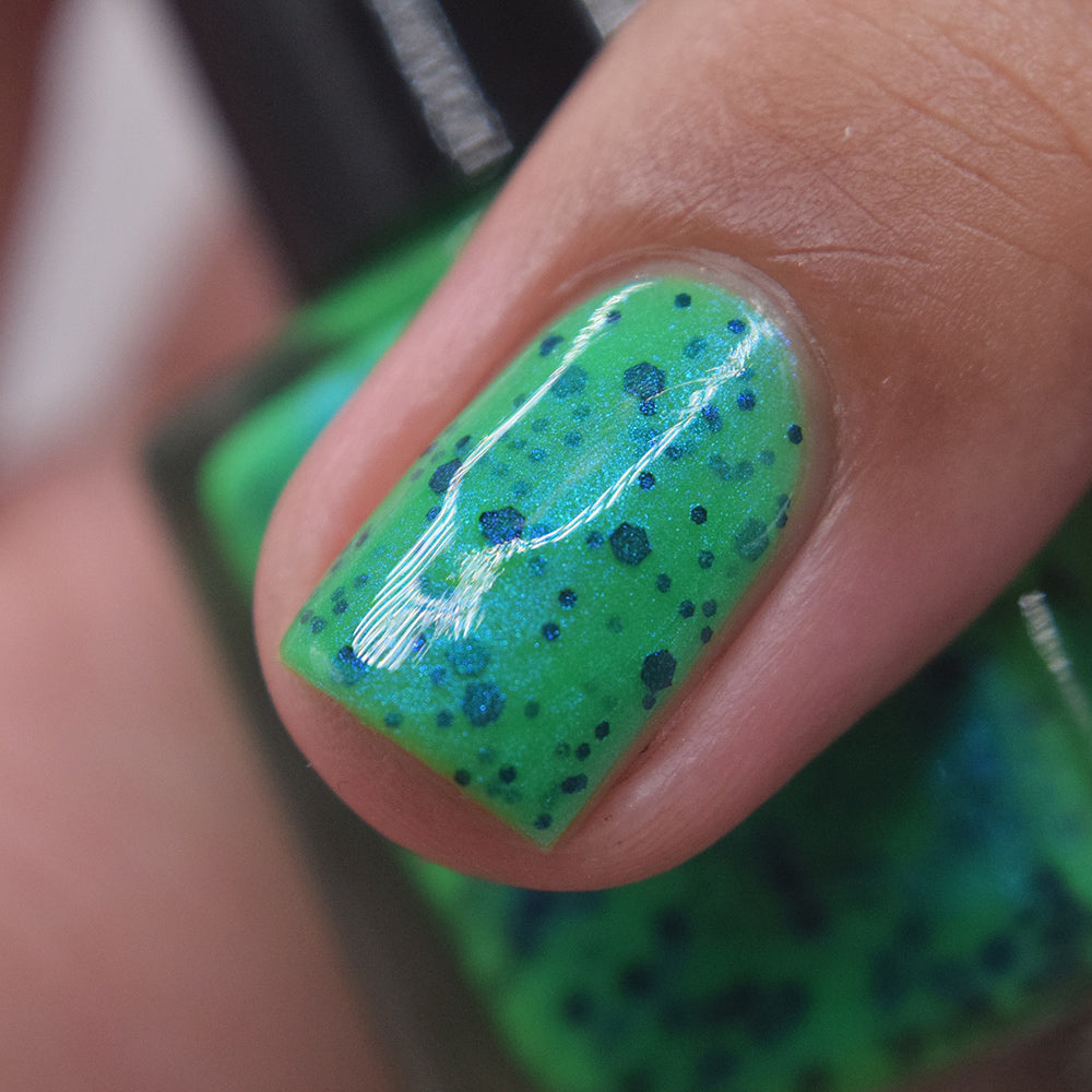 A neon green nail polish with a blue aurora shimmer and black glitters.
