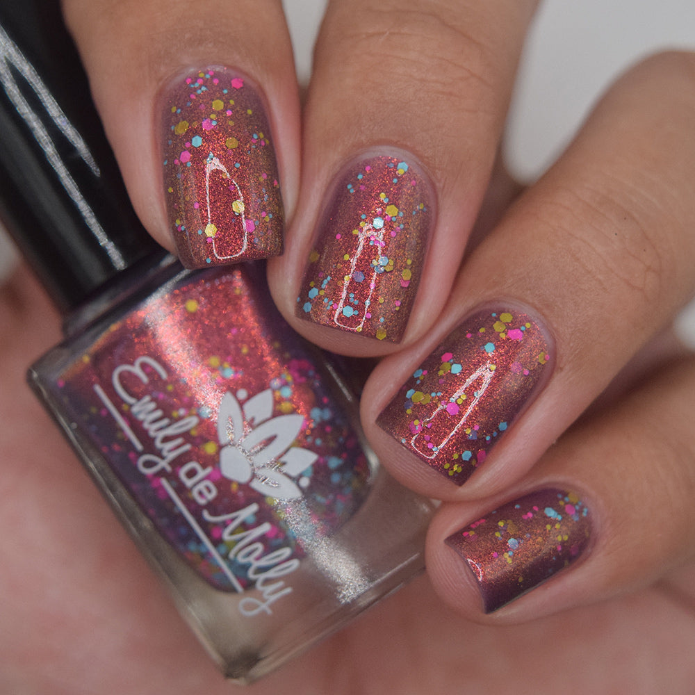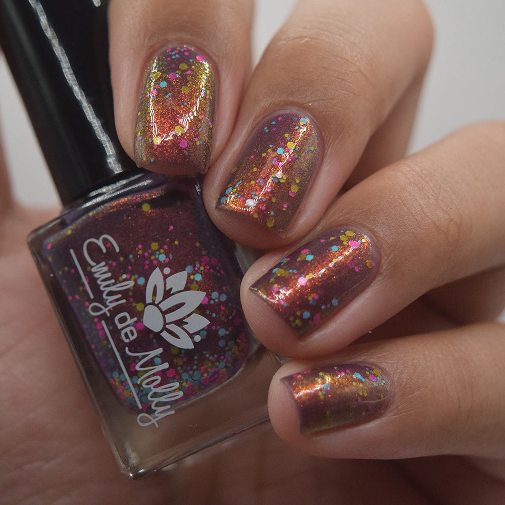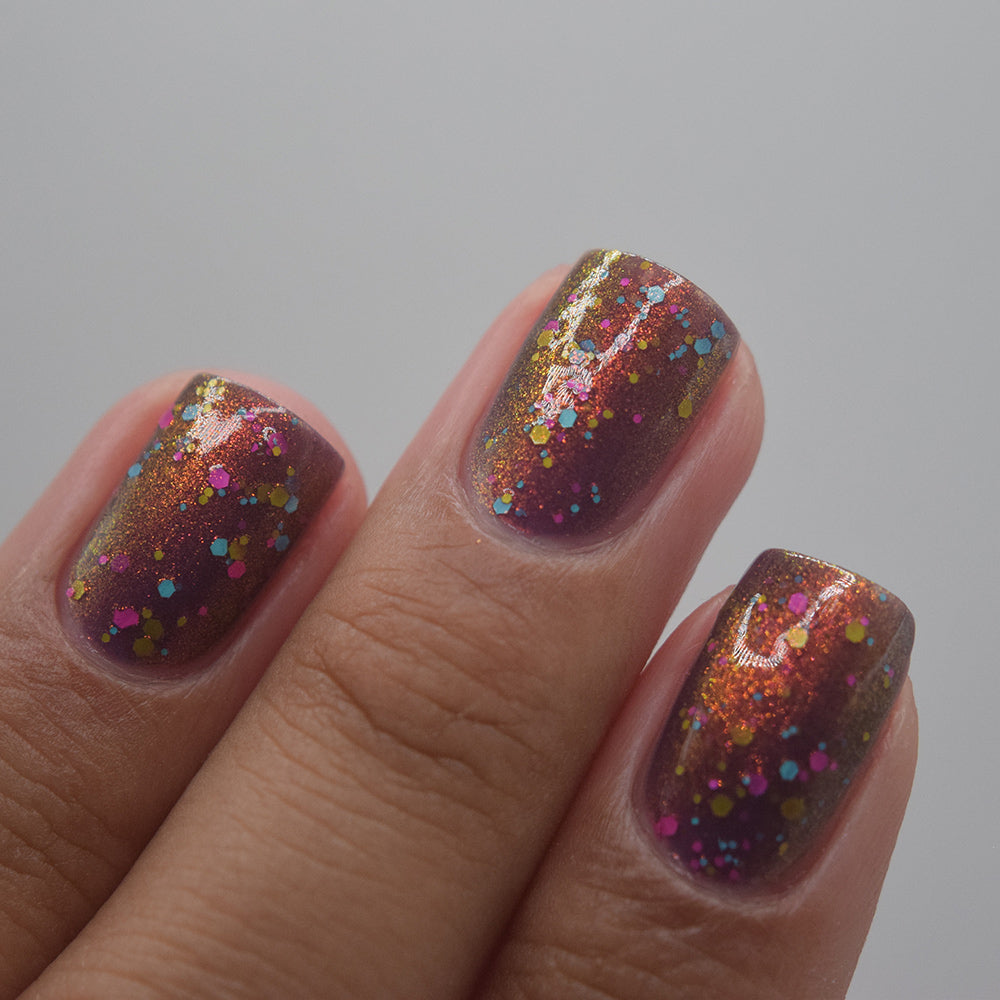 A grey nail polish with a very strong copper / gold / green shifting aurora shimmer and glitters in pink, yellow and blue.