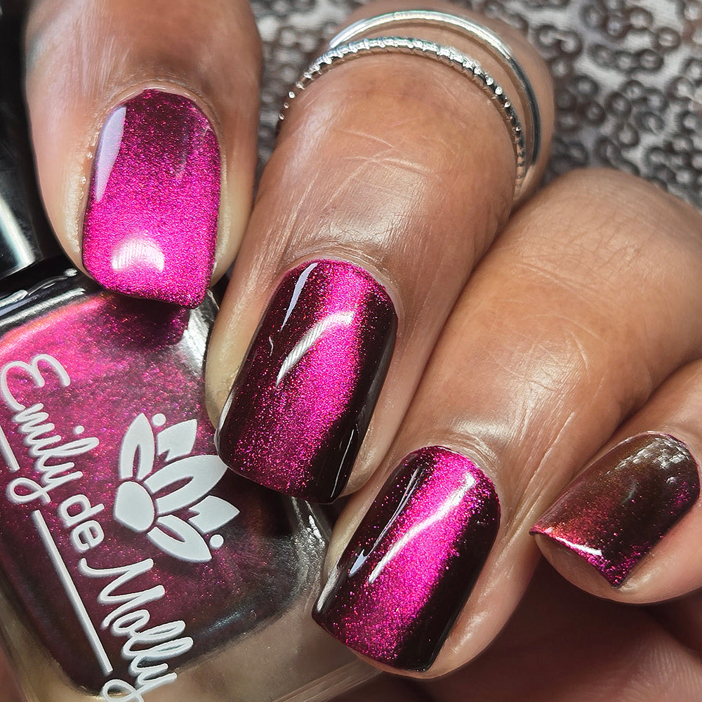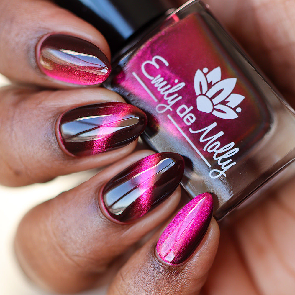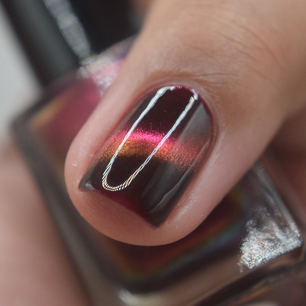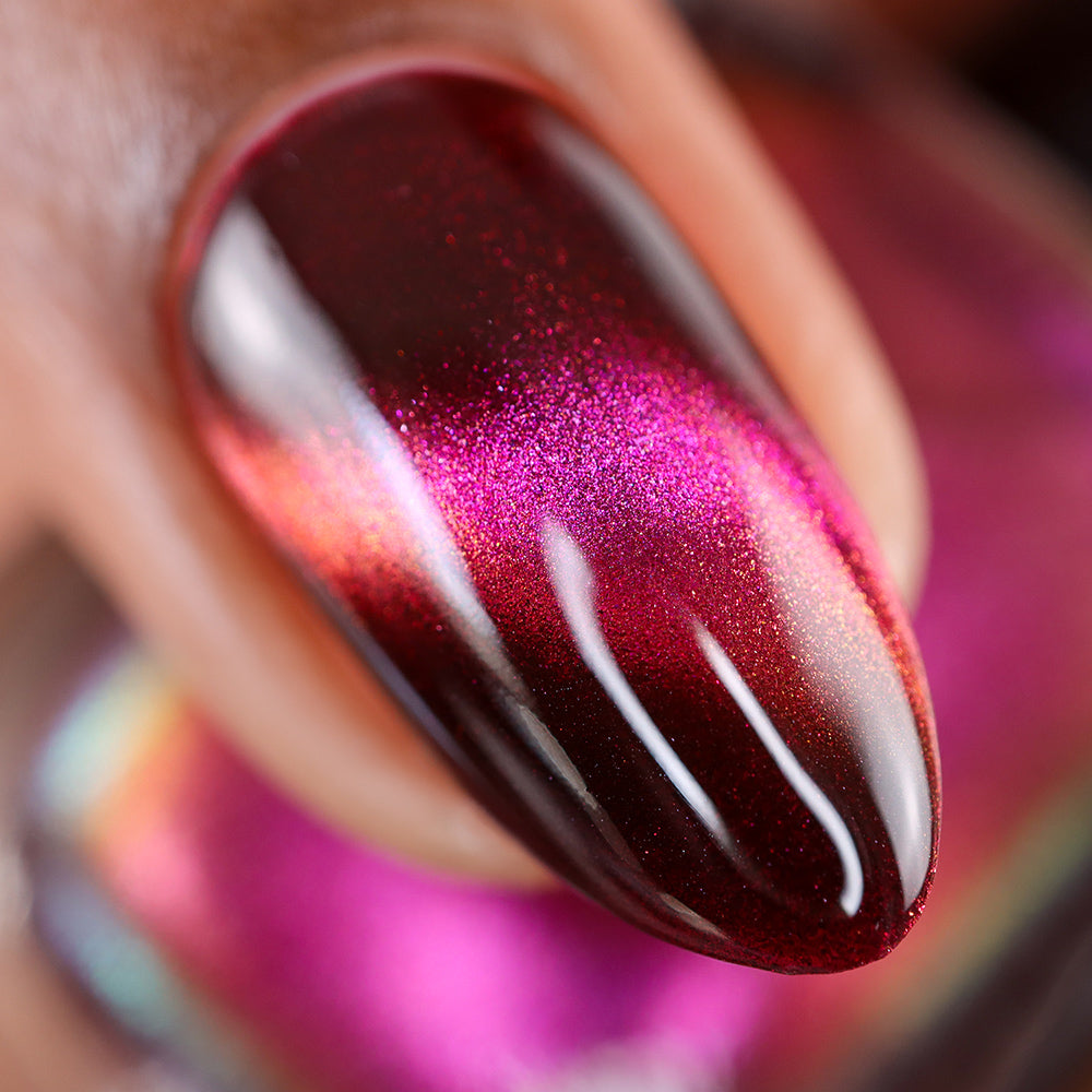 A deep berry red nail polish with a pink / orange shifting magnetic effect.