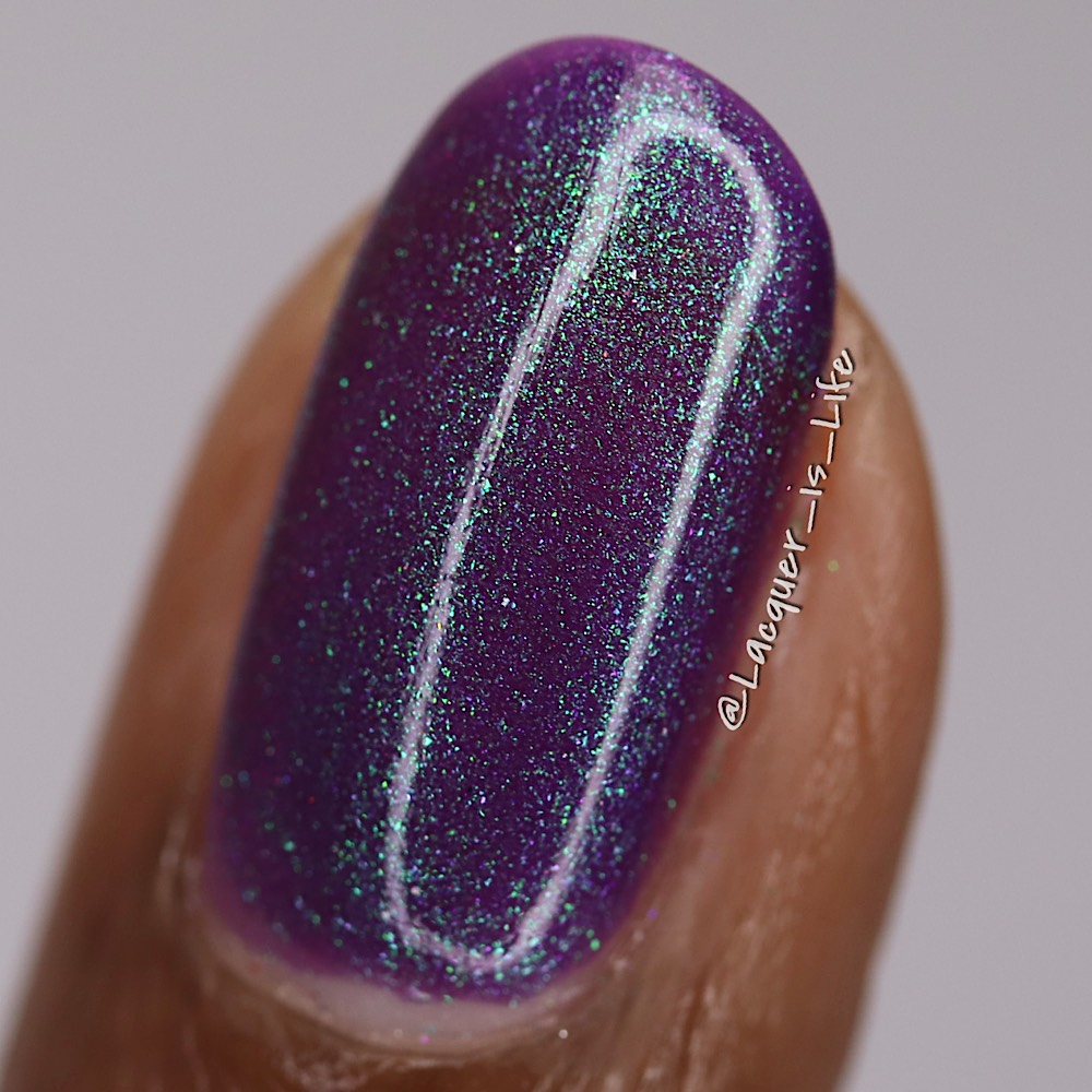 Sticky Situation nail polish is a shimmery nod to the beautiful wrapping paper we love to have but sometimes hate to use. This rich, jewel-toned purple shade leans toward grape, with hints of fuchsia visible at certain angles. A jade-green to dusty-teal shimmer fades into the purple base, creating a striking finish.