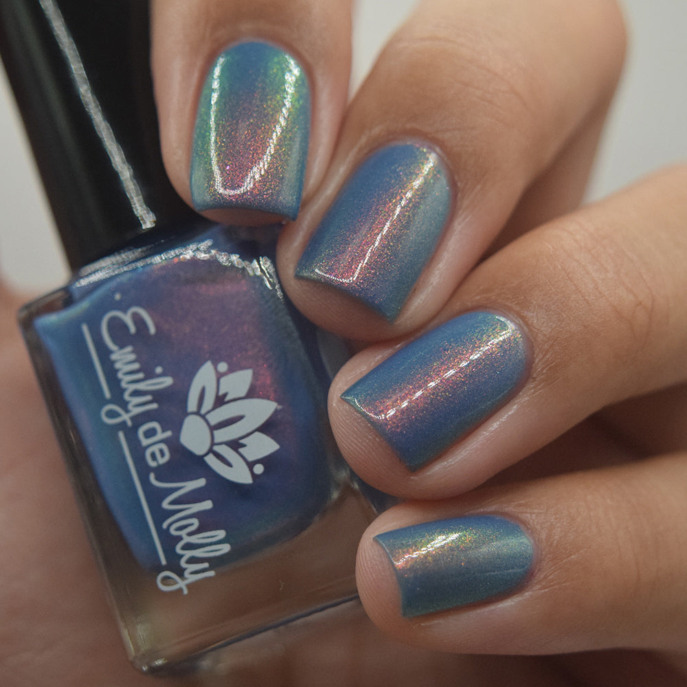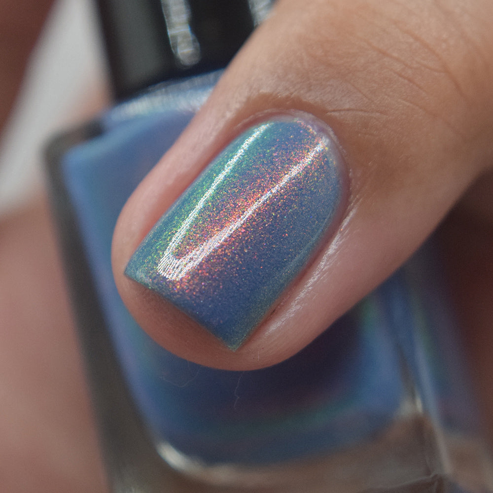 A medium blue nail polish with copper / gold / green shifting aurora shimmer.