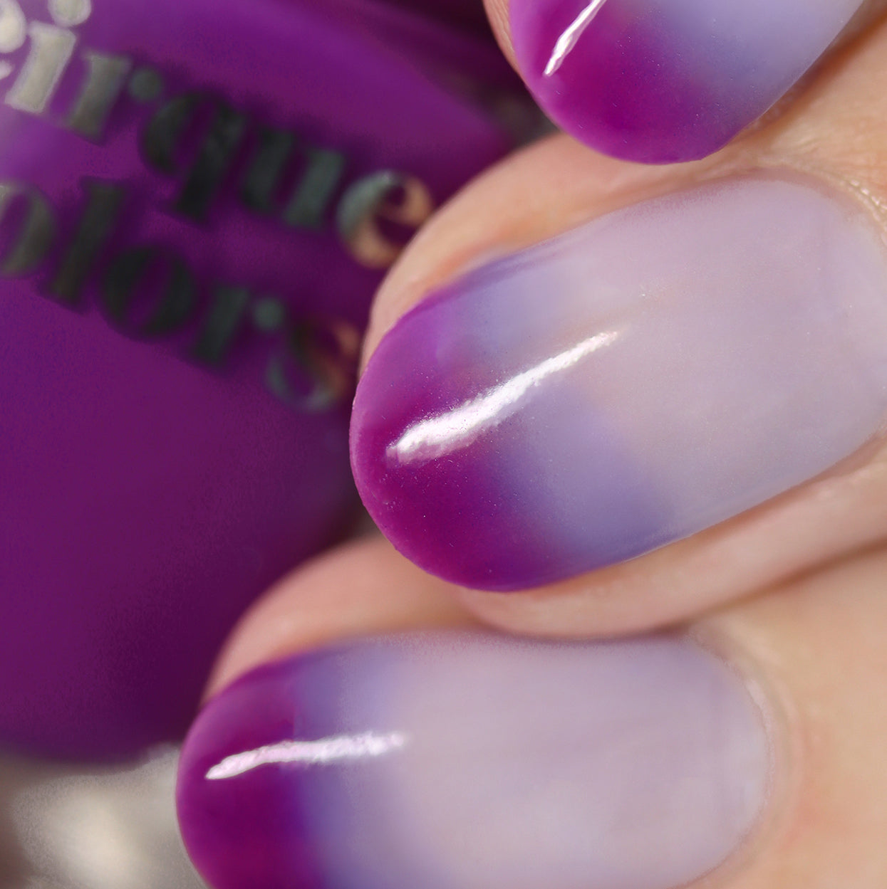 Enchanted is a thermal nail polish that changes color based on temperature. This polish changes to a vivid purple when cold and to a lilac when warm. You may notice shades of light lavender as the polish travels through the color spectrum and between the cold and warm states.